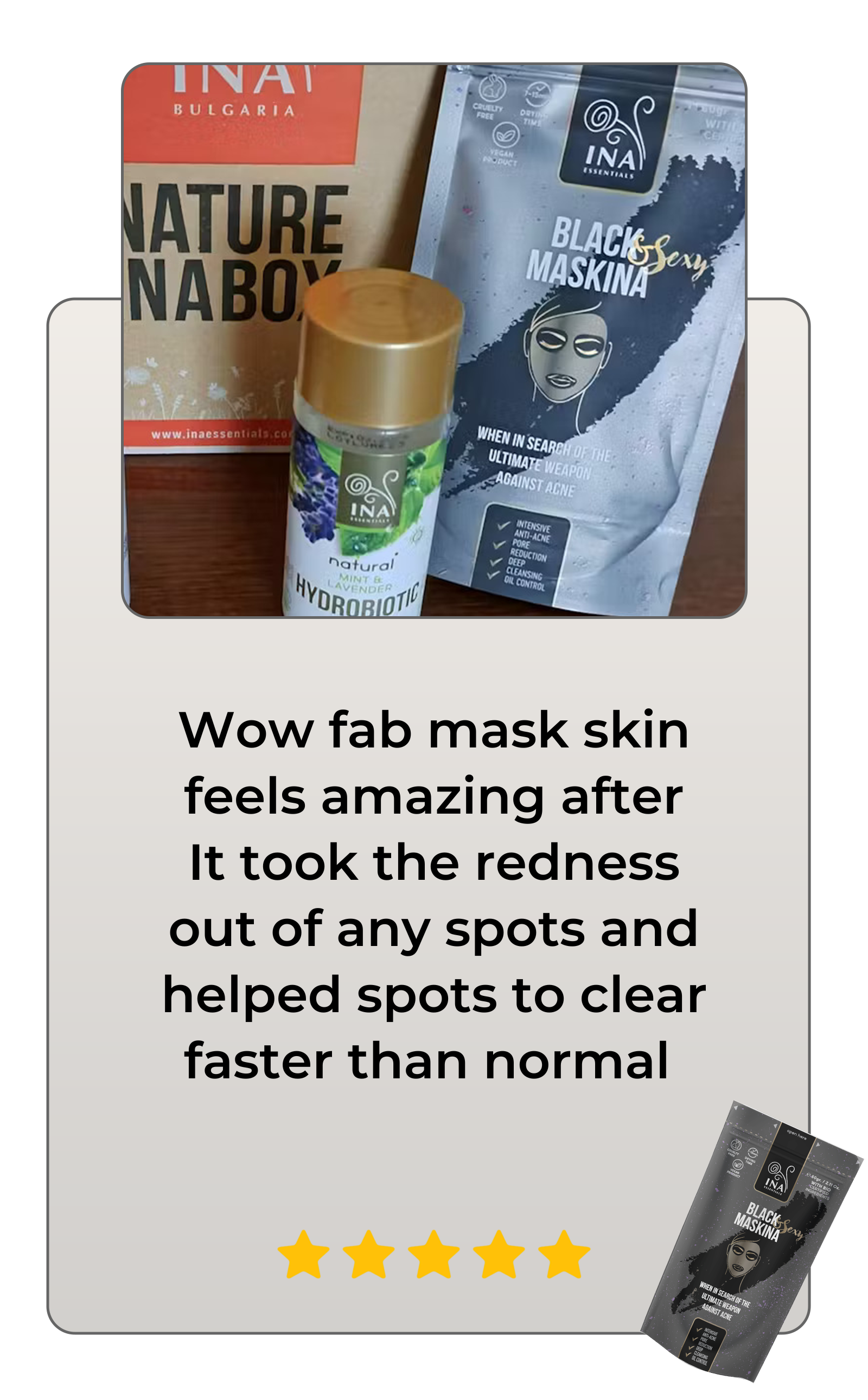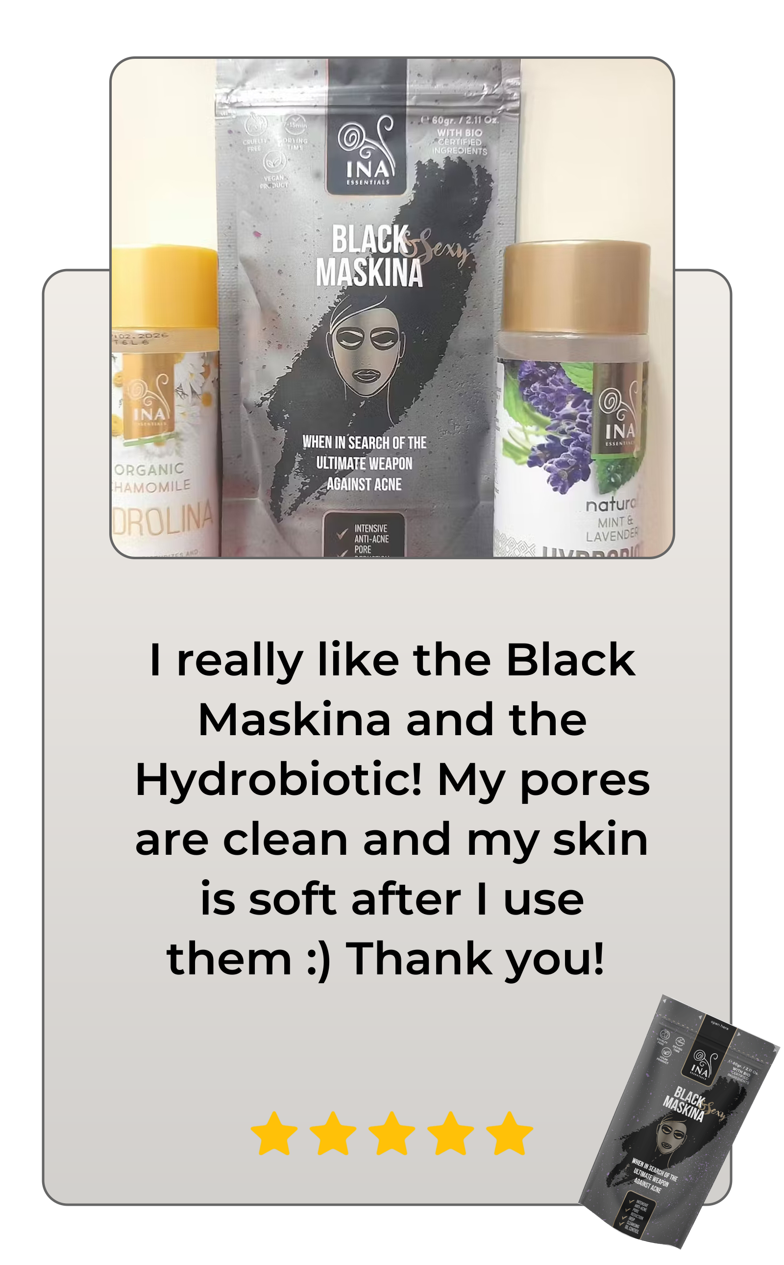 Dopo meno di un mese di utilizzo regolare, gli effetti curativi di Black Maskina sono pienamente percepibili. I segni dell'acne sono notevolmente ridotti e il viso è libero da punti neri e altre impurità. La barriera cutanea è più forte e la sua naturale capacità di regolare la produzione di olio è rigenerata, per un aspetto bello e luminoso.