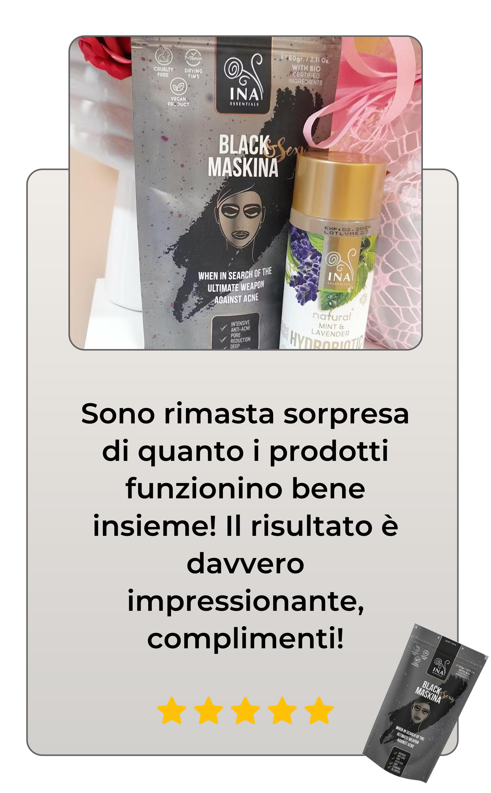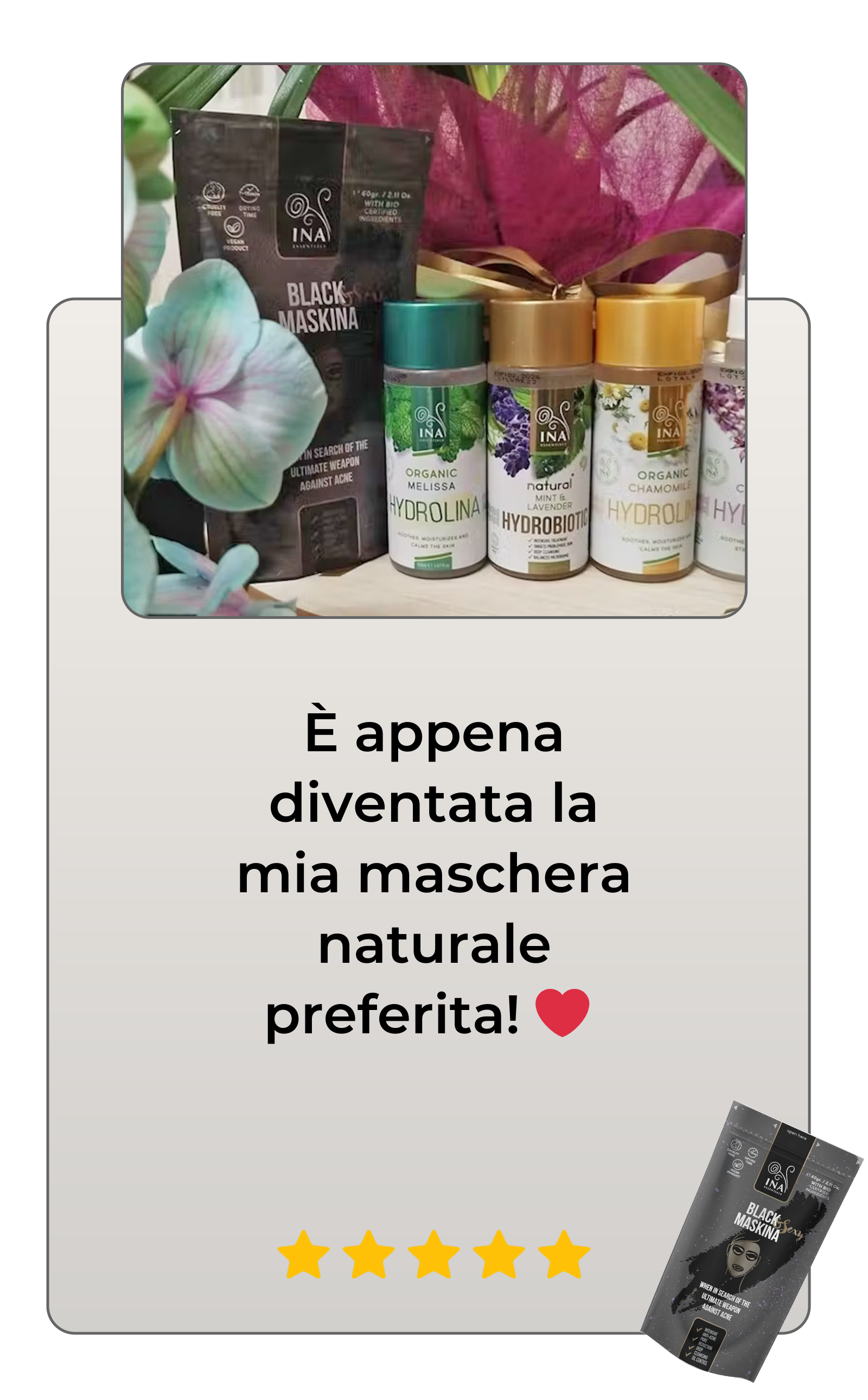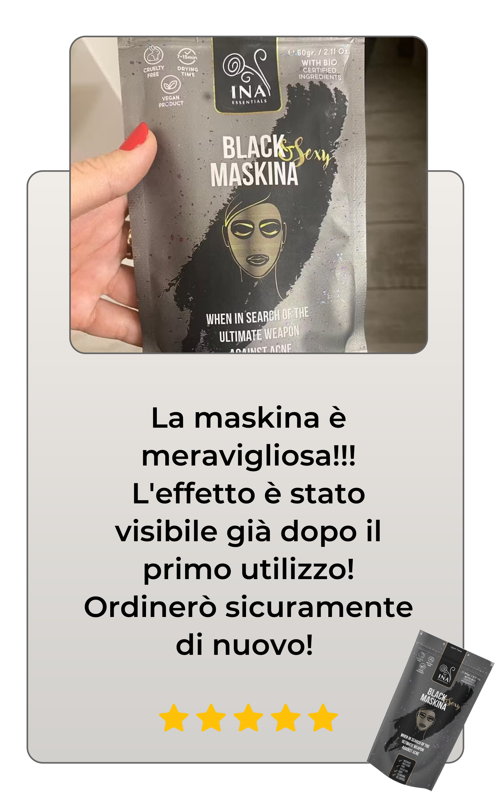 *Si consiglia di utilizzare Maskina non più di una volta ogni 4 giorni, altrimenti si rischia di seccare eccessivamente la pelle. Non dimenticate di idratare la pelle con Hydrolina dopo ogni applicazione di Maskina.