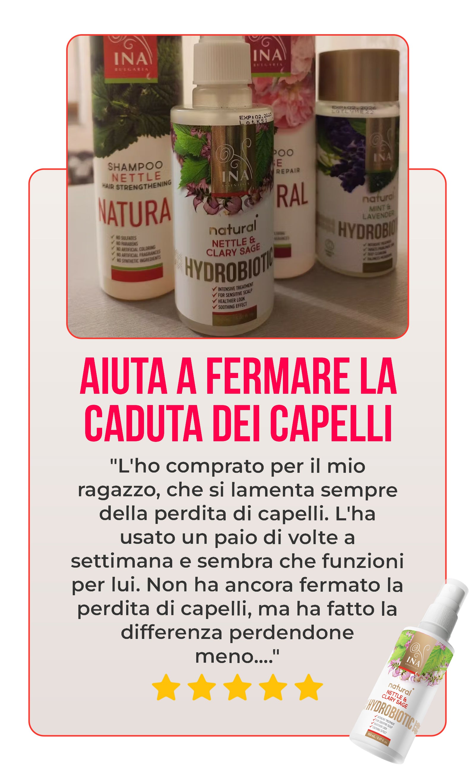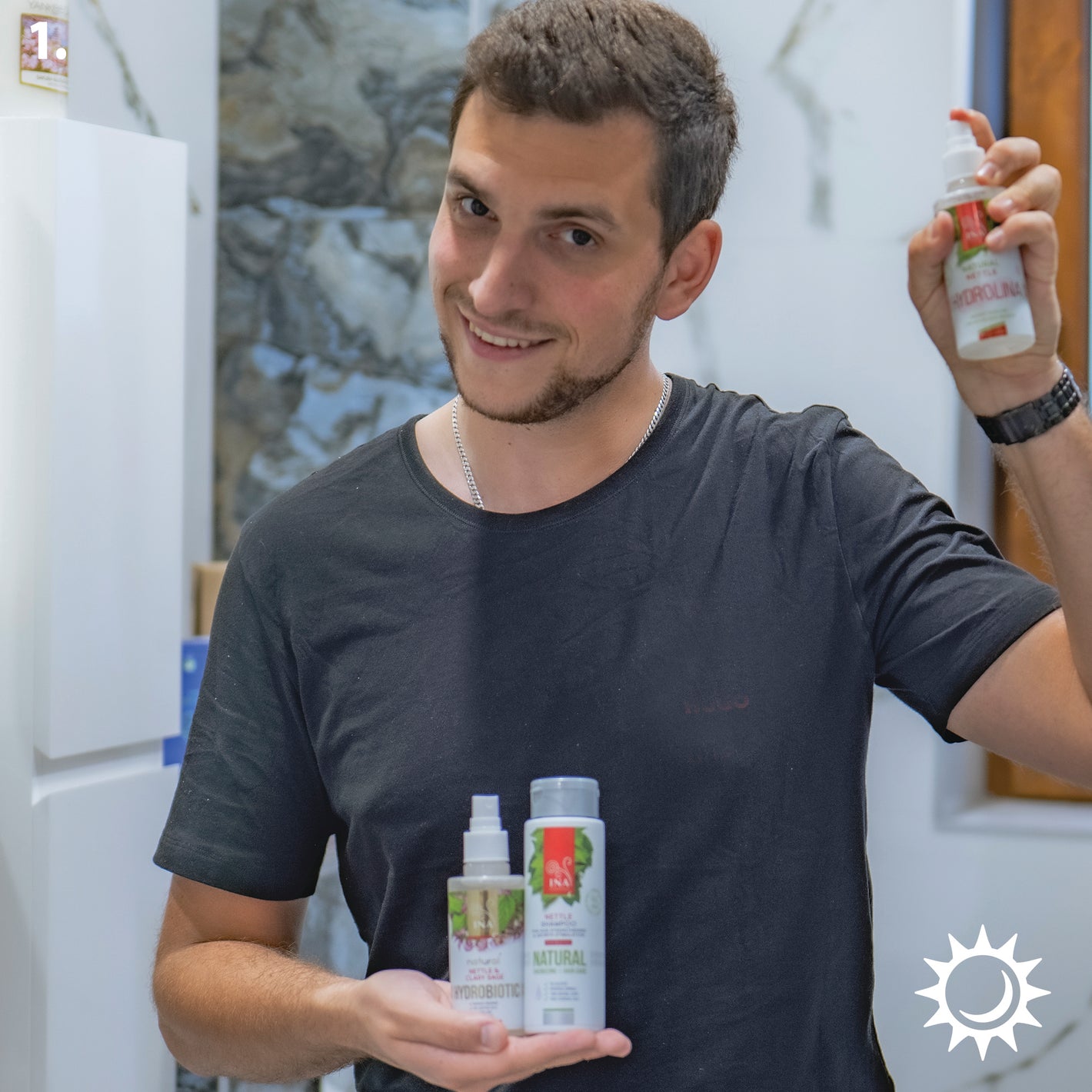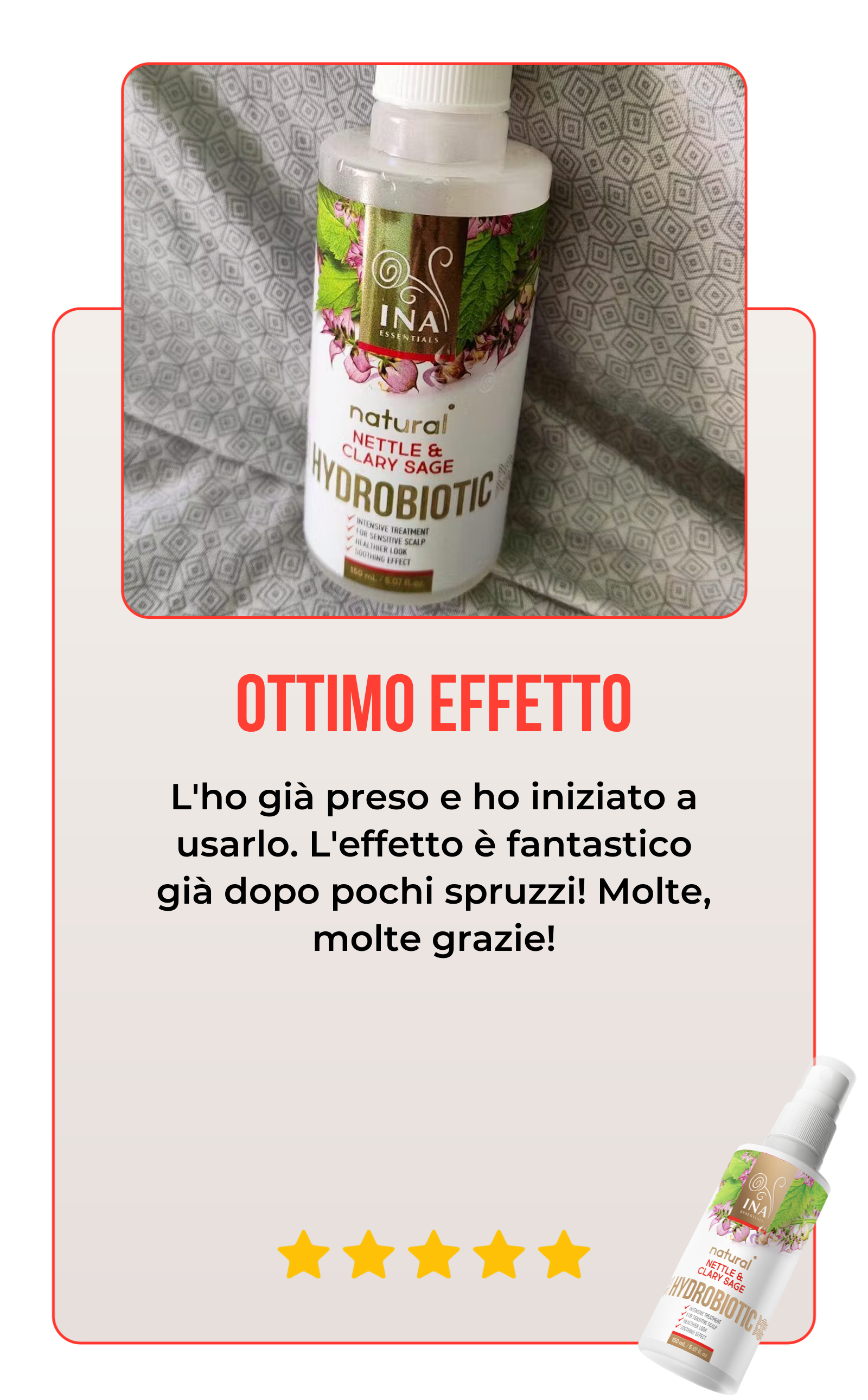 - Passo 2: Concludere il RoutINA™ con Hydrobiotic - Ortica e Salvia sclarea. Questa formula innovativa è alimentata da Hyperferment, un complesso postbiotico di ortica, corteccia di quercia e liquirizia, appositamente sviluppato nel laboratorio high-tech di Bologna. Si è scoperto che ognuna di queste piante ha proprietà specifiche benefiche per la crescita dei capelli e per la salute generale. Idrata profondamente e riequilibra il microbiota del cuoio capelluto, agendo efficacemente come protezione notturna per il cuoio capelluto e i capelli.