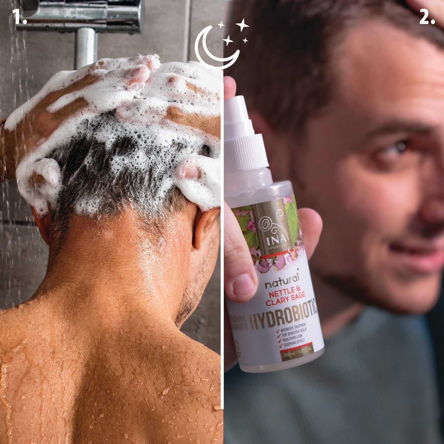 - Passo 1: Detergere il cuoio capelluto con il nostro nuovo e migliorato Shampoo Naturale all'Ortica per la Perdita dei Capelli, arricchito con il complesso postbiotico Hyperferment - estratti di ortica fermentata, corteccia di quercia e liquirizia. Questo shampoo non solo elimina lo sporco della giornata, ma rafforza anche i capelli, ne stimola la crescita e ne riduce la caduta, mantenendo la naturale idratazione.