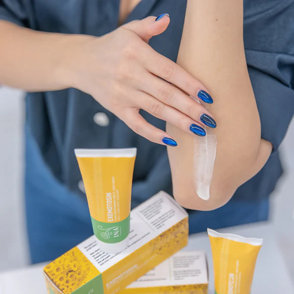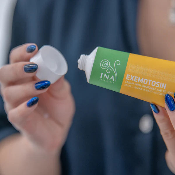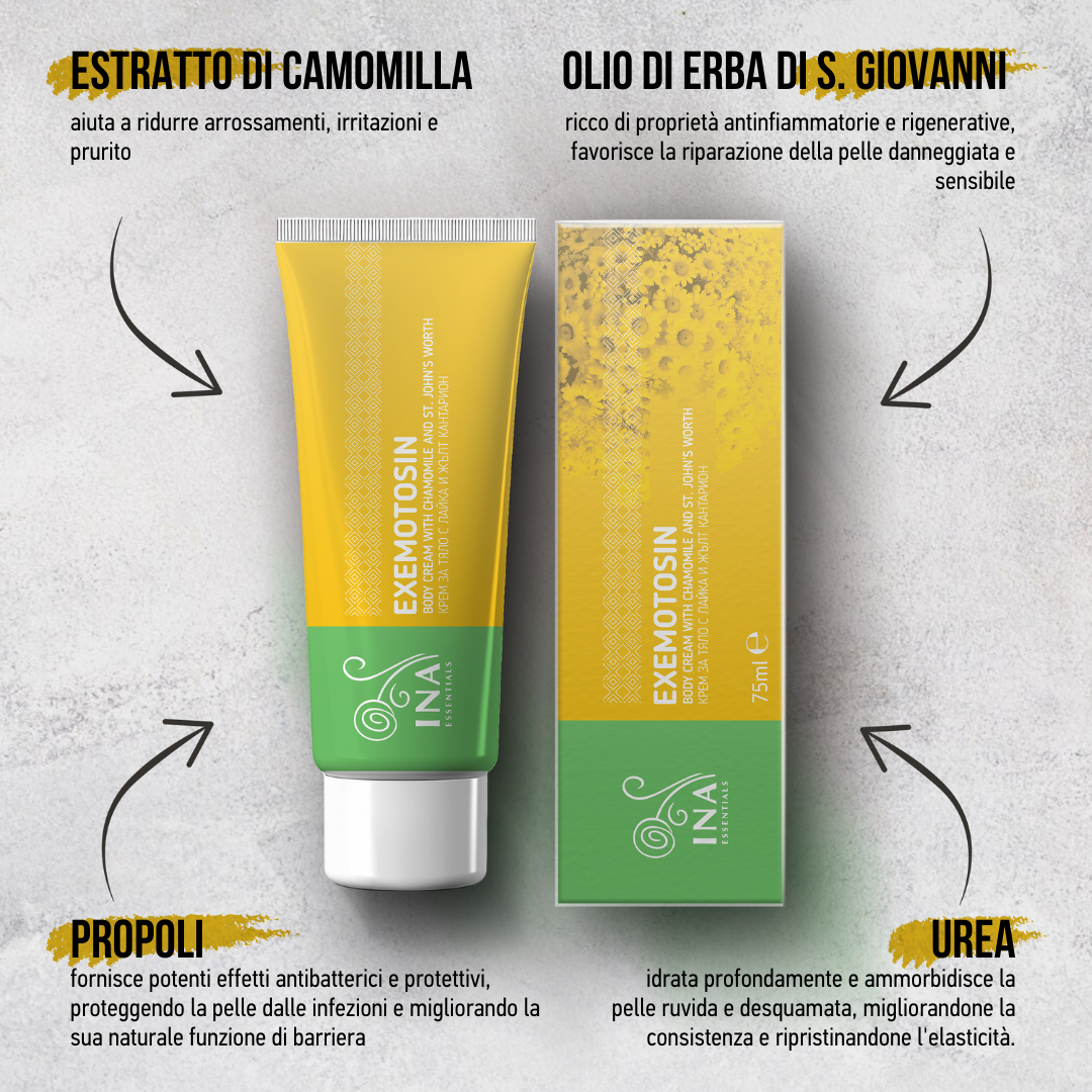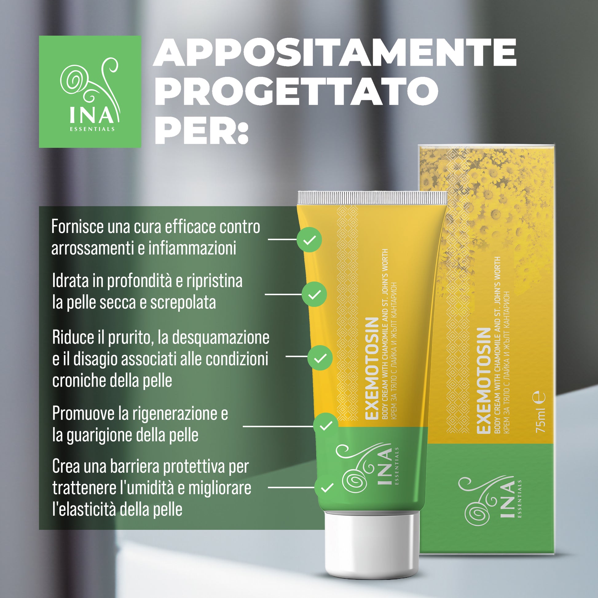 Exemotosin di InaEssentials è una crema nutriente di alta qualità, delicata e senza profumi, con principi attivi naturali. È appositamente formulata per soddisfare le esigenze della pelle secca, desquamata, pruriginosa e arrossata, comprese le condizioni della pelle come la psoriasi e l'eczema.