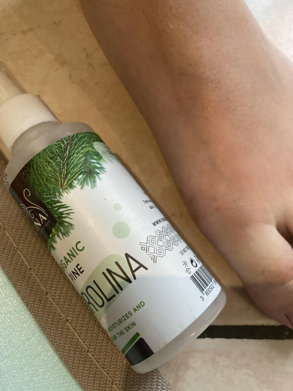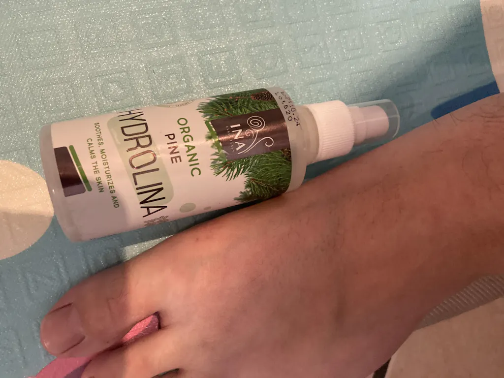 - Passo 1: Spruzzare la nostra Acqua di Pino Bianco 100% biologica - Hydrolina. Le proprietà antimicotiche dell'acqua di pino bloccano la crescita dei funghi, attenuano gli odori e creano uno scudo protettivo contro gli agenti irritanti quotidiani. È ideale per l'applicazione diurna, in particolare prima di infilare scarpe o tacchi che possono far sudare i piedi. Riduce al minimo le possibilità di sfregamento dei piedi e offre una sensazione rinfrescante.