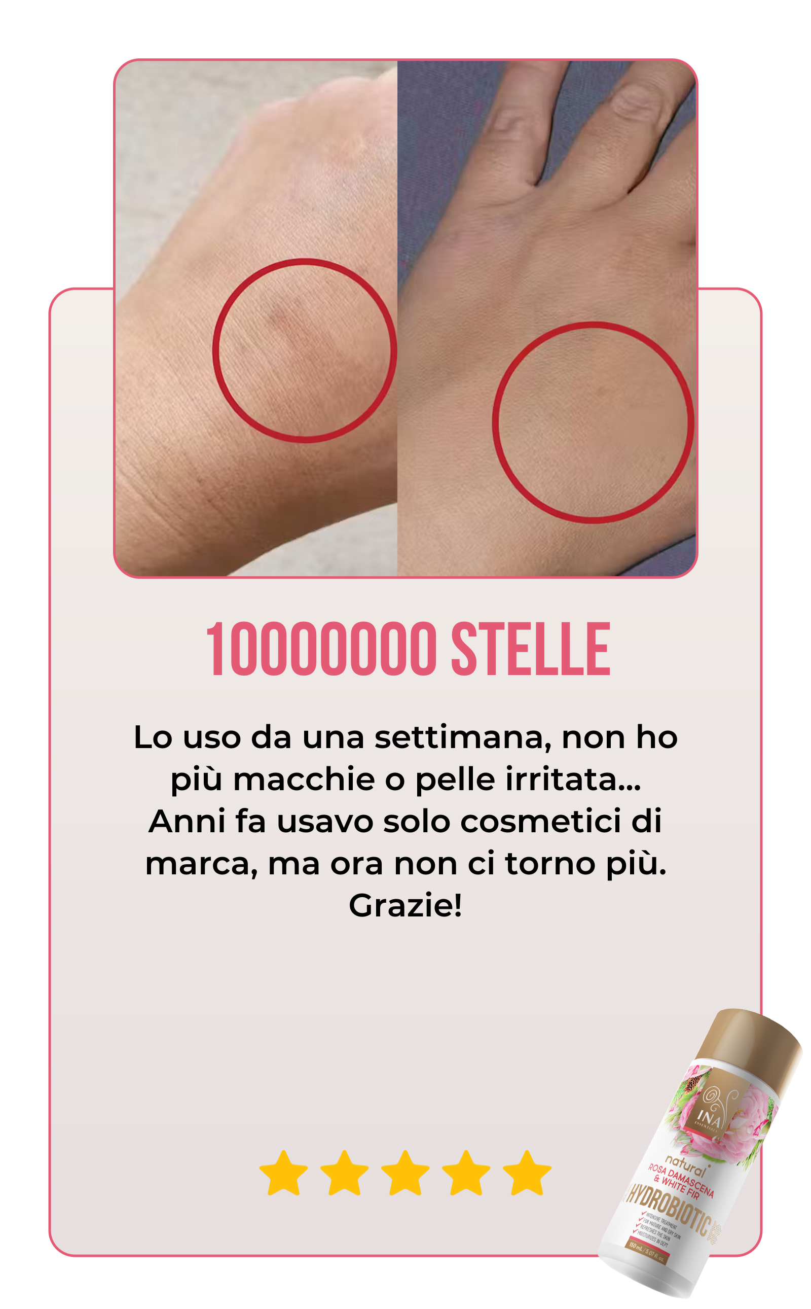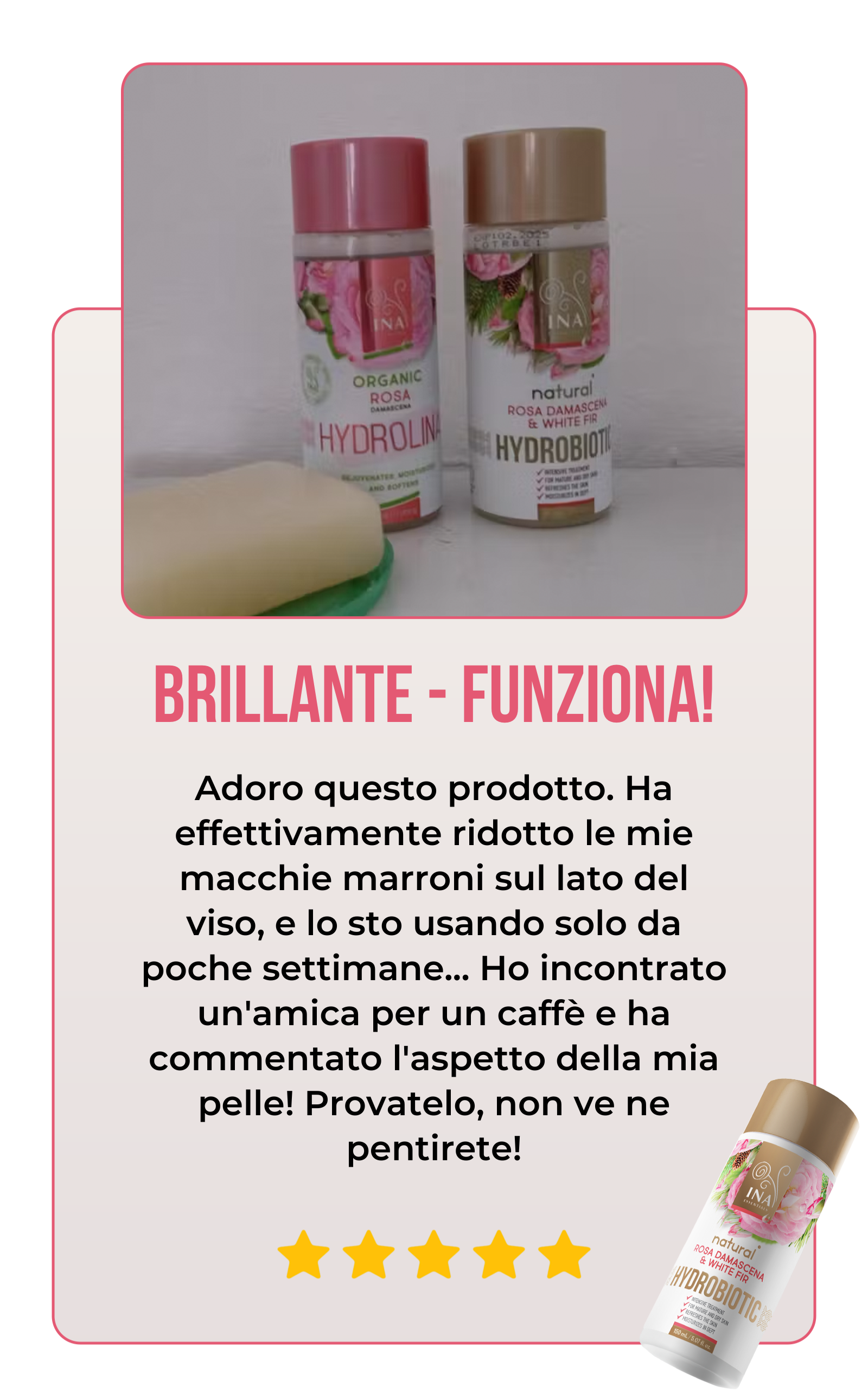 Hydrobiotic - Rose, Abete Bianco & Buccia di Limone è molto più di un semplice flacone, ma è supportato da testimonianze reali di clienti. Con un impressionante punteggio di soddisfazione dei clienti superiore al 90%, il nostro prodotto dimostra la sua efficacia nel ridurre le linee sottili e le macchie pigmentarie. Non fidatevi solo della nostra parola. Leggete le storie dei nostri clienti QUI.