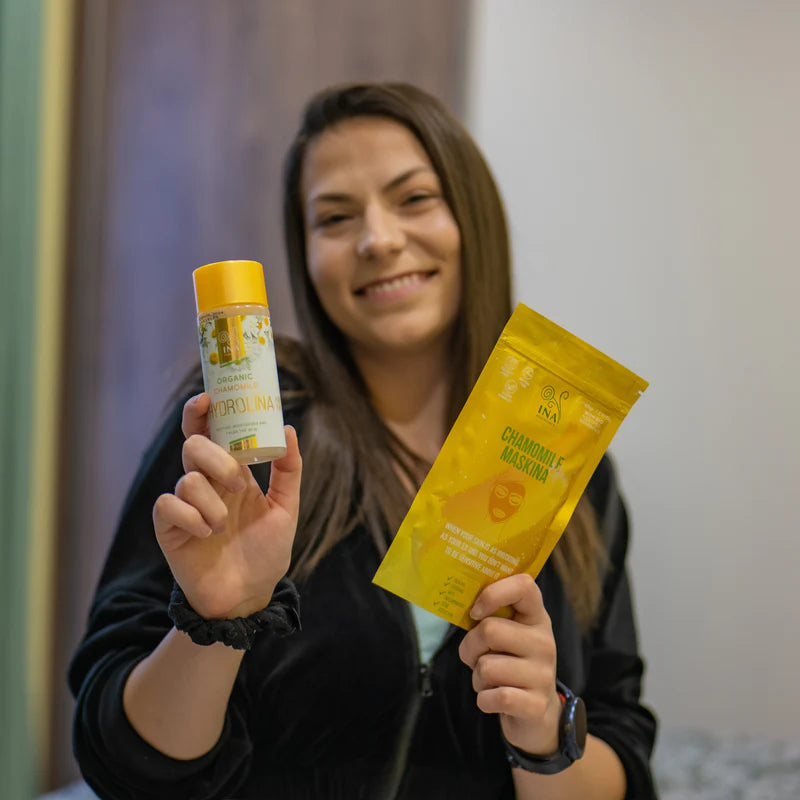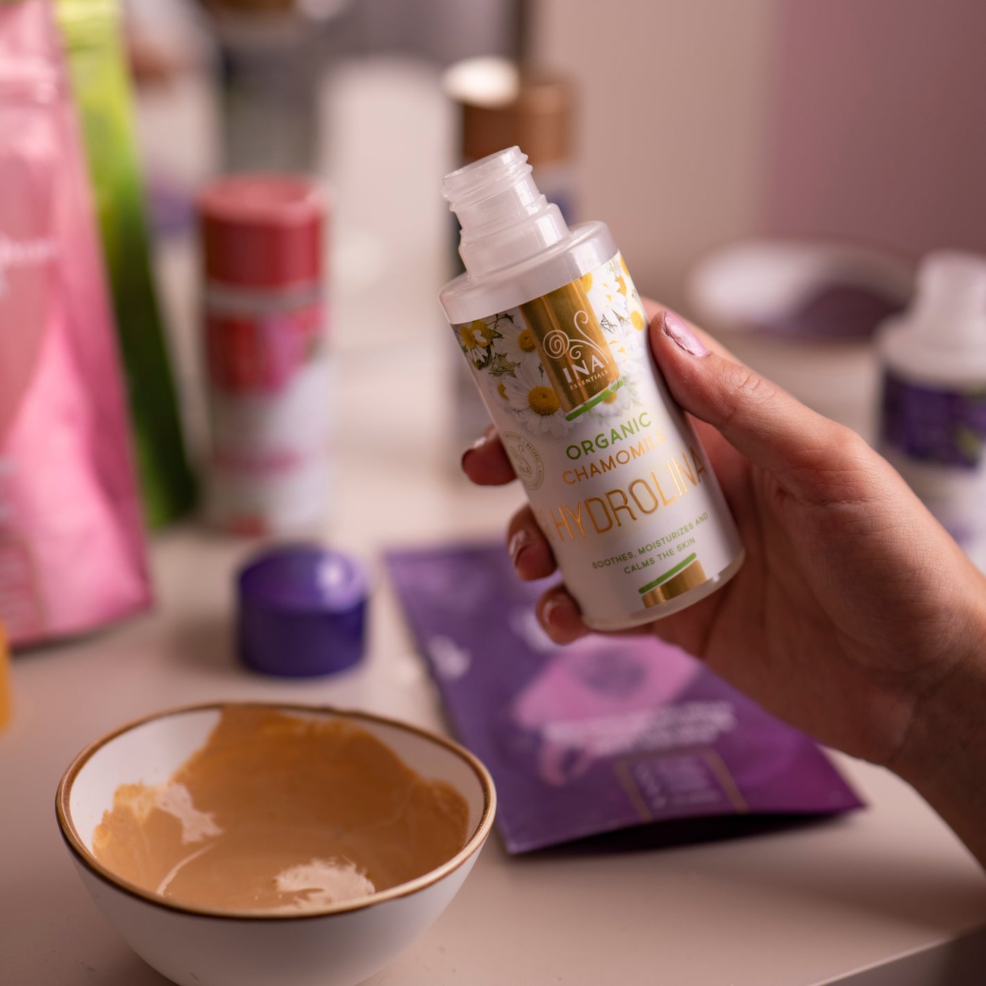 Risciacquare con acqua tiepida, terminare con acqua fredda per chiudere i pori e applicare l'acqua di camomilla - Hydrolina di InaEssentials per tonificare la pelle, se è necessario.
