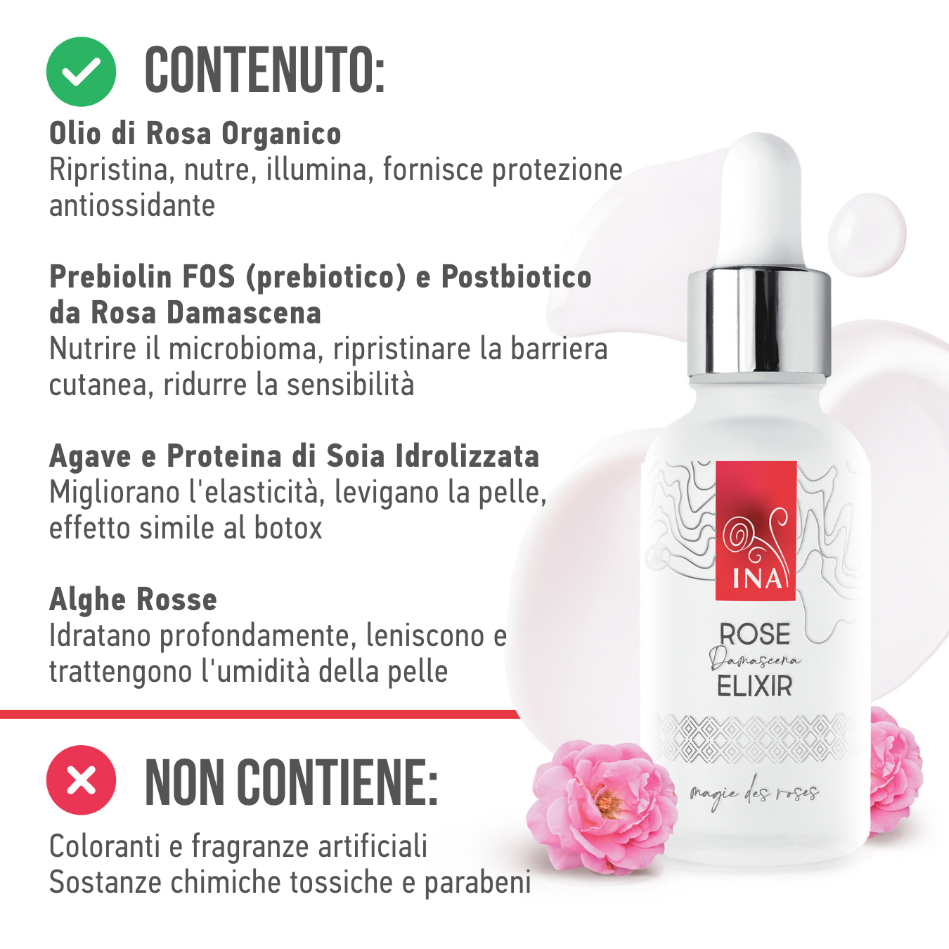 Rose Elixir è estremamente equilibrato, con potenti antiossidanti e ingredienti idratanti naturali, che lo rendono una scelta eccellente per mantenere una pelle sana e luminosa a partire dai 20-25 anni, quando è consigliabile iniziare i trattamenti antietà. Se necessario, può essere utilizzato anche su pelli più giovani: è adatto a partire dai 12 anni e non presenta controindicazioni per i bambini.