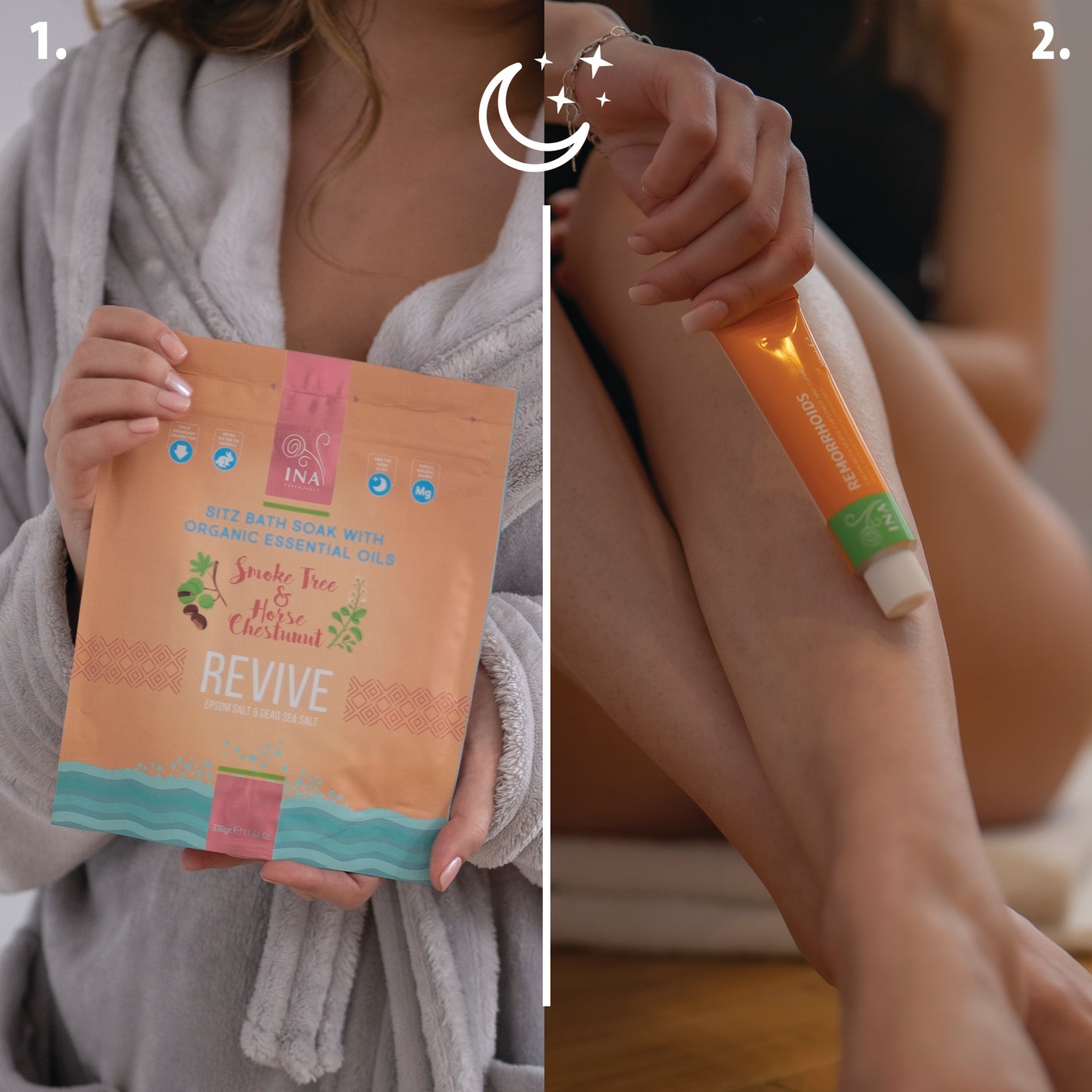 - Passo 1: 1-3 volte alla settimana, concedetevi un bagno rilassante utilizzando i nostri sali da bagno Revive Sitz con Smoke Tree e Ippocastano. Questi sali, arricchiti con estratto di ippocastano e olio di albero del fumo, alleviano la sensazione di pesantezza e stanchezza delle gambe, riducono lo stress e favoriscono la rigenerazione della pelle. Il magnesio contenuto nei sali favorisce la rigenerazione della pelle, promuovendo un più rapido sollievo delle aree interessate.